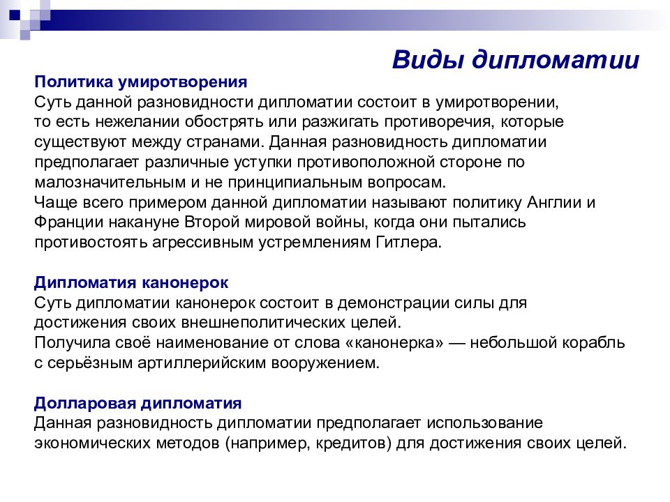 Виды дипломатии Политика умиротворения Суть данной разновидности дипломатии состоит в умиротворении, то есть нежелании обострять или разжигать противоречия, которые существуют между странами. Данная разновидность дипломатии предполагает различные уступки противоположной стороне по малозначительным и не принципиальным вопросам. Чаще всего примером данной дипломатии называют политику Англии и Франции накануне Второй мировой войны, когда они пытались противостоять агрессивным устремлениям Гитлера. Дипломатия канонерок Суть дипломатии канонерок состоит в демонстрации силы для достижения своих внешнеполитических целей. Получила своё наименование от слова «канонерка» — небольшой корабль с серьёзным артиллерийским вооружением. Долларовая дипломатия Данная разновидность дипломатии предполагает использование экономических методов (например, кредитов) для достижения своих целей.