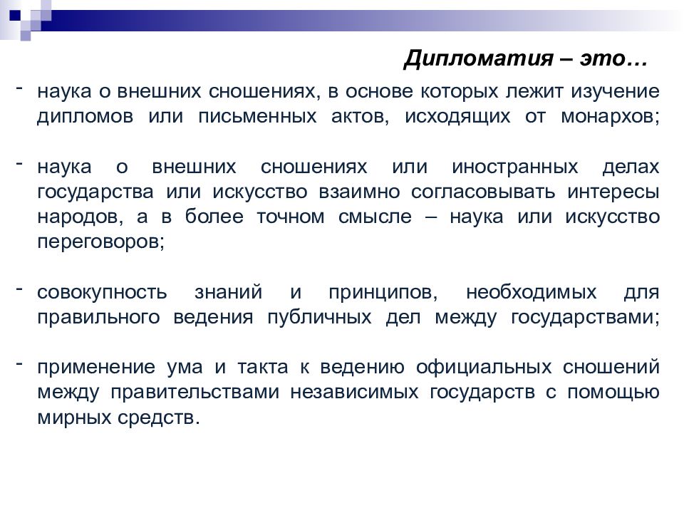 н аука о внешних сношениях, в основе которых лежит изучение дипломов или письменных актов, исходящих от монархов; н аука о внешних сношениях или иностранных делах государства или искусство взаимно согласовывать интересы народов, а в более точном смысле – наука или искусство переговоров; с овокупность знаний и принципов, необходимых для правильного ведения публичных дел между государствами; п рименение ума и такта к ведению официальных сношений между правительствами независимых государств с помощью мирных средств.