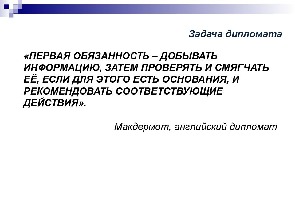 «ПЕРВАЯ ОБЯЗАННОСТЬ – ДОБЫВАТЬ ИНФОРМАЦИЮ, ЗАТЕМ ПРОВЕРЯТЬ И СМЯГЧАТЬ ЕЁ, ЕСЛИ ДЛЯ ЭТОГО ЕСТЬ ОСНОВАНИЯ, И РЕКОМЕНДОВАТЬ СООТВЕТСТВУЮЩИЕ ДЕЙСТВИЯ». Макдермот, английский дипломат