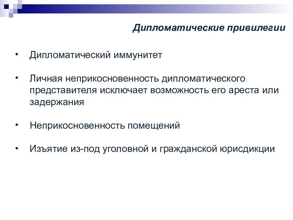 Дипломатический иммунитет Личная неприкосновенность дипломатического представителя исключает возможность его ареста или задержания Неприкосновенность помещений Изъятие из-под уголовной и гражданской юрисдикции