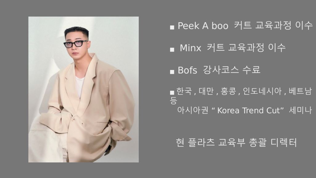 Слайд 2: Peek A boo 커트 교육과정 이수 ■ Minx 커트 교육과정 이수 ■ Bofs 강사코스 수료 ■ 한국, 대만, 홍콩, 인도네시아, 베트남 등 아시아권 “Korea Trend Cut” 세미나 현 플라츠 교육부 총괄 디렉터