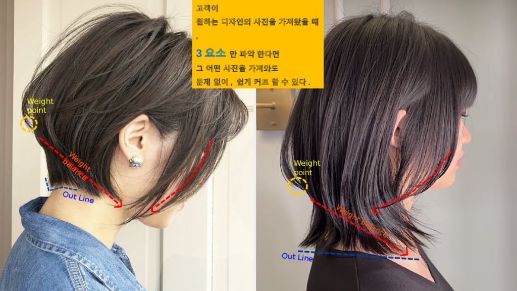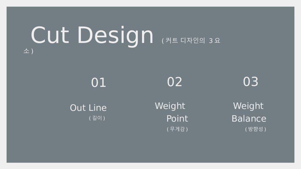 Weight point Weight balance Out Line Weight point Weight balance Out Line 고객이 원하는 디자인의 사진을 가져왔을 때, 3 요소 만 파악 한다면 그 어떤 사진을 가져와도 문제 없이, 쉽게 커트 할 수 있다.