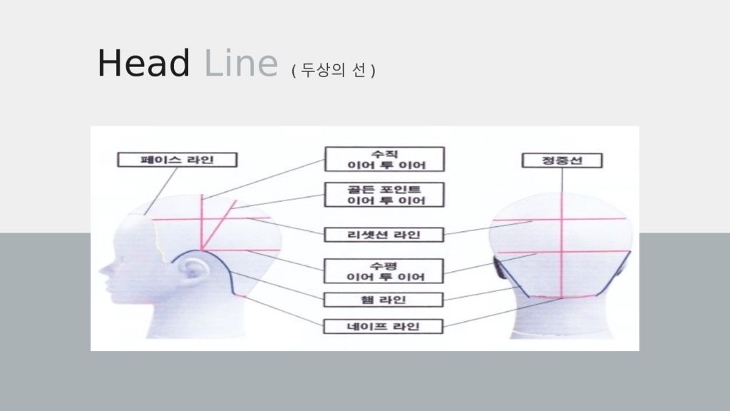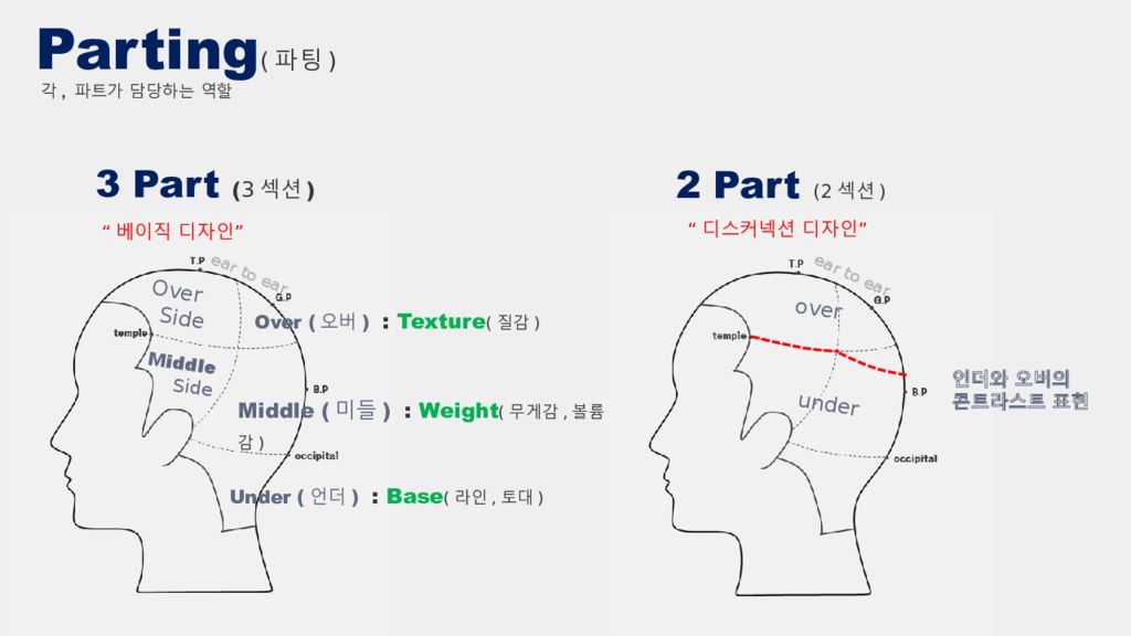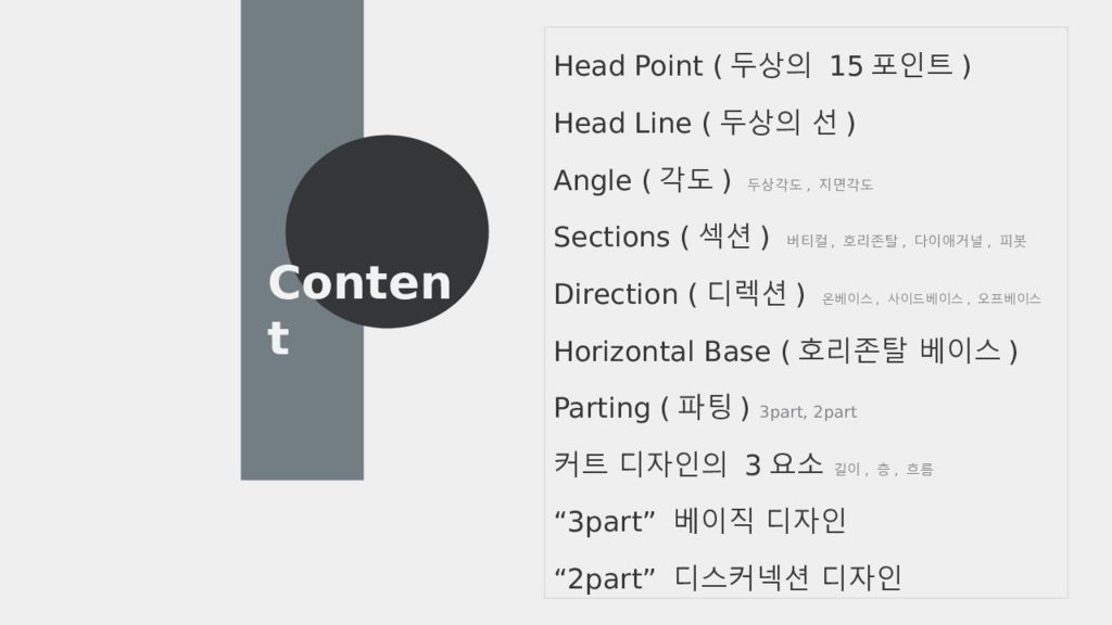 Content Head Point (두상의 15포인트) Head Line ( 두상의 선) Angle (각도) 두상각도, 지면각도 Sections (섹 션 ) 버티컬, 호리존탈, 다이애거널, 피봇 Direction ( 디렉션 ) 온베이스, 사이드베이스, 오프베이스 Horizontal Base ( 호리존탈 베이스 ) Parting ( 파팅 ) 3part, 2part 커트 디자인의 3 요소 길이, 층, 흐름 “3part” 베이직 디자인 “2part” 디스커넥션 디자인