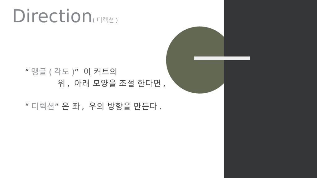 “ 앵글 ( 각도 ) ” 이 커트의 위, 아래 모양을 조절 한다면, “ 디렉션 ” 은 좌, 우의 방향을 만든다.