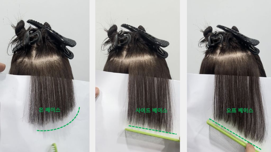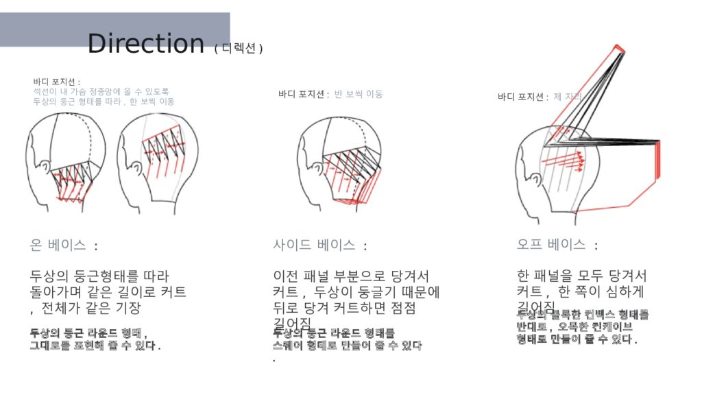 온 베이스 : 두상의 둥근형태를 따라 돌아가며 같은 길이로 커트, 전체가 같은 기장 사이드 베이스 : 이전 패널 부분으로 당겨서 커트, 두상이 둥글기 때문에 뒤로 당겨 커트하면 점점 길어짐 오프 베이스 : 한 패널을 모두 당겨서 커트, 한 쪽이 심하게 길어짐 Direction ( 디렉션 ) 두상의 둥근 라운드 형태를 스퀘어 형태로 만들어 줄 수 있다. 두상의 볼록한 컨벡스 형태를 반대로, 오목한 컨케이브 형태로 만들어 줄 수 있다. 두상의 둥근 라운드 형태, 그대로를 표현해 줄 수 있다. 바디 포지션 : 섹션이 내 가슴 정중앙에 올 수 있도록 두상의 둥근 형태를 따라, 한 보씩 이동 바디 포지션 : 반 보씩 이동 바디 포지션 : 제 자리