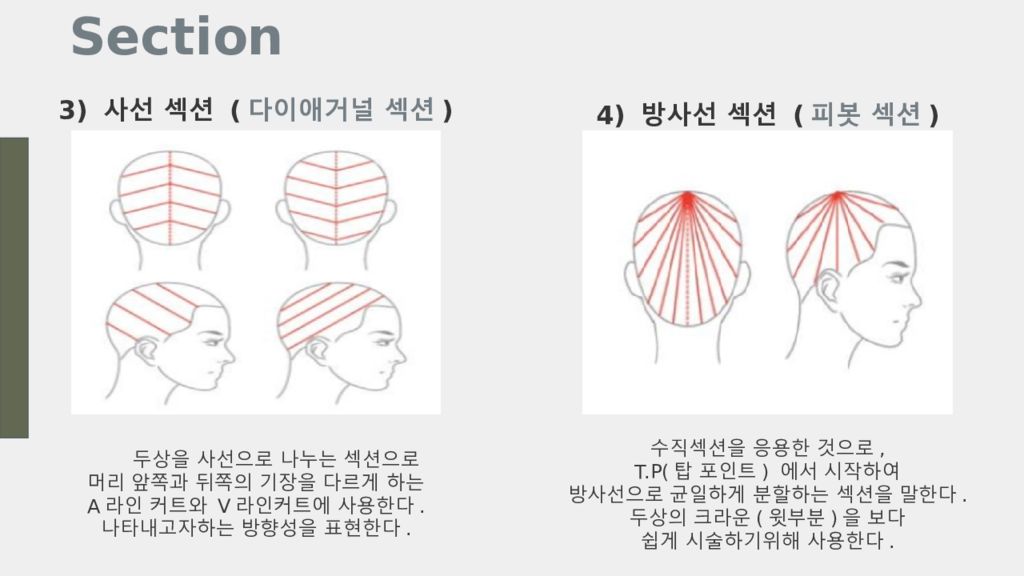 3) 사선 섹션 ( 다이애거널 섹션 ) 두상을 사선으로 나누는 섹션으로 머리 앞쪽과 뒤쪽의 기장을 다르게 하는 A 라인 커트와 V 라인커트에 사용한다. 나타내고자하는 방향성을 표현한다. 4) 방사선 섹션 ( 피봇 섹션 ) 수직섹션을 응용한 것으로, T.P( 탑 포인트 ) 에서 시작하여 방사선으로 균일하게 분할하는 섹션을 말한다. 두상의 크라운 ( 윗부분 ) 을 보다 쉽게 시술하기위해 사용한다. Section