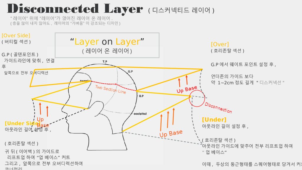 Disconnected Layer ( 디스커넥티드 레이어 ) Two Section Line Up Base Up Base Disconnection “ Layer on Layer ” ( 레이어 온 레이어 ) [Under] 아웃라인 길이 설정 후, ( 호리존탈 섹션 ) 아웃라인 가이드에 맞추어 전부 리프트업 하여 “ 업 베이스 “ 이때, 두상의 둥근형태를 스퀘어형태로 당겨서 커트. [Over] ( 호리존탈 섹션 ) G.P 에서 웨이트 포인트 설정 후, 언더존의 가이드 보다 약 1~2cm정도 길게 " 디스커넥션 " [Under Side] 아웃라인 길이 설정 후, ( 호리존탈 섹션 ) 귀 뒤 ( 이어백 ) 의 가이드로 리프트업 하여 “ 업 베이스 ” 커트 그리고, 앞쪽으로 전부 오버디렉션하여 코너정리 Up Base [Over Side] ( 버티컬 섹션 ) G.P ( 골덴포인트 ) 가이드라인에 맞춰, 연결 후 앞쪽으로 전부 오버디렉션 “ 레이어 ” 위에 “ 레이어 ” 가 얹어진 레이어 온 레이어. ( 층을 많이 내지 않아도, 레이어의 “ 가벼움 ” 이 강조되는 디자인 )
