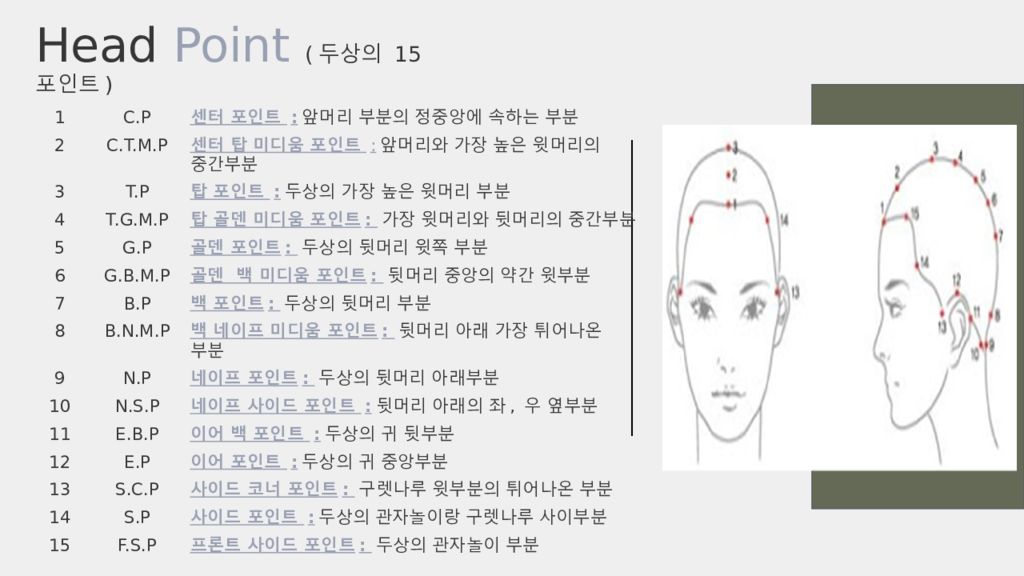 1 C.P 센터 포인트 : 앞머리 부분의 정중앙에 속하는 부분 2 C.T.M.P 센터 탑 미디움 포인트 : 앞머리와 가장 높은 윗머리의 중간부분 3 T.P 탑 포인트 : 두상의 가장 높은 윗머리 부분 4 T.G.M.P 탑 골덴 미디움 포인트 : 가장 윗머리와 뒷머리의 중간부분 5 G.P 골덴 포인트 : 두상의 뒷머리 윗쪽 부분 6 G.B.M.P 골덴 백 미디움 포인트 : 뒷머리 중앙의 약간 윗부분 7 B.P 백 포인트 : 두상의 뒷머리 부분 8 B.N.M.P 백 네이프 미디움 포인트 : 뒷머리 아래 가장 튀어나온 부분 9 N.P 네이프 포인트 : 두상의 뒷머리 아래부분 10 N.S.P 네이프 사이드 포인트 : 뒷머리 아래의 좌, 우 옆부분 11 E.B.P 이어 백 포인트 : 두상의 귀 뒷부분 12 E.P 이어 포인트 : 두상의 귀 중앙부분 13 S.C.P 사이드 코너 포인트 : 구렛나루 윗부분의 튀어나온 부분 14 S.P 사이드 포인트 : 두상의 관자놀이랑 구렛나루 사이부분 15 F.S.P 프론트 사이드 포인트 : 두상의 관자놀이 부분 Head Point ( 두상의 15 포인트 )