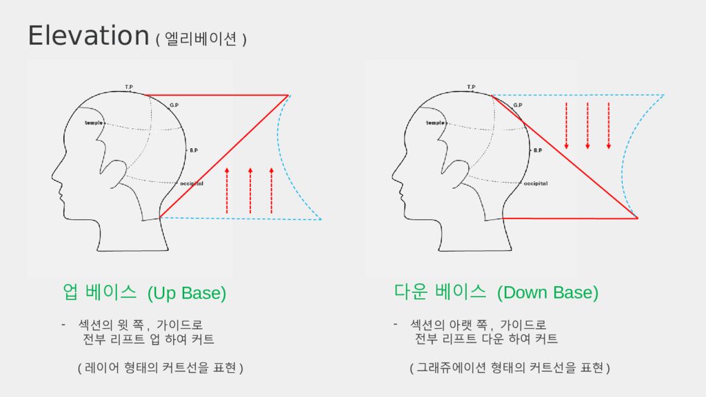 Elevation ( 엘리베이션 ) 업 베이스 (Up Base) 섹션의 윗 쪽, 가이드로 전부 리프트 업 하여 커트 ( 레이어 형태의 커트선을 표현 ) 다운 베이스 (Down Base) 섹션의 아랫 쪽, 가이드로 전부 리프트 다운 하여 커트 ( 그래쥬에이션 형태의 커트선을 표현 )
