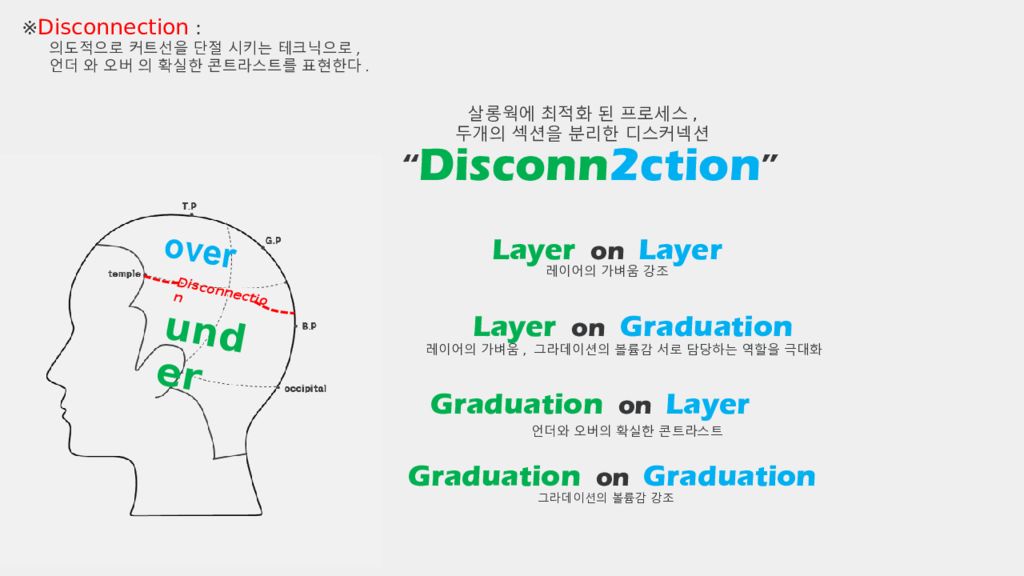 ※ Disconnection : 의도적으로 커트선을 단절 시키는 테크닉으로, 언더 와 오버 의 확실한 콘트라스트를 표현한다. “ Disconn 2ction ” Layer on Layer Layer on Graduation Graduation on Layer Graduation on Graduation 레이어의 가벼움 강조 레이어의 가벼움, 그라데이션의 볼륨감 서로 담당하는 역할을 극대화 언더와 오버의 확실한 콘트라스트 그라데이션의 볼륨감 강조 살롱웍에 최적화 된 프로세스, 두개의 섹션을 분리한 디스커넥션 under over Disconnection