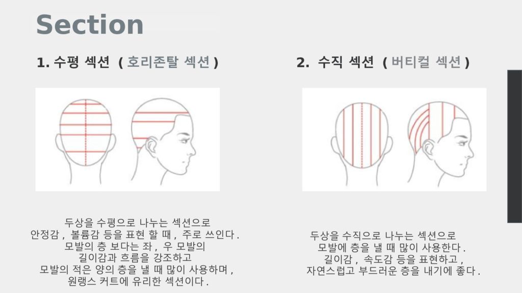 1. 수평 섹션 ( 호리존탈 섹션 ) 두상을 수평으로 나누는 섹션으로 안정감, 볼륨감 등을 표현 할 때, 주로 쓰인다. 모발의 층 보다는 좌, 우 모발의 길이감과 흐름을 강조하고 모발의 적은 양의 층을 낼 때 많이 사용하며, 원랭스 커트에 유리한 섹션이다. Section 2. 수직 섹션 ( 버티컬 섹션 ) 두상을 수직으로 나누는 섹션으로 모발에 층을 낼 때 많이 사용한다. 길이감, 속도감 등을 표현하고, 자연스럽고 부드러운 층을 내기에 좋다.