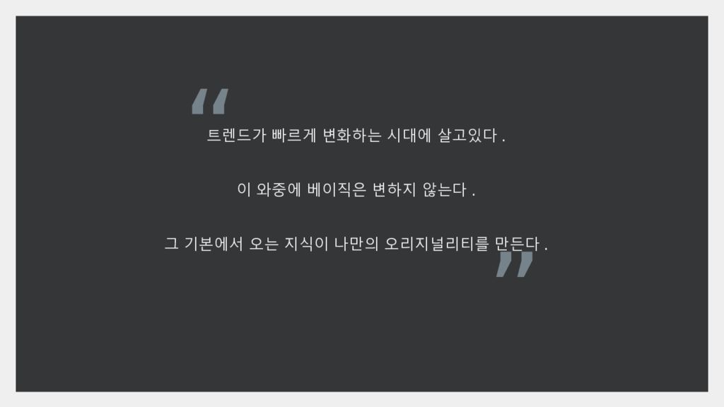 Слайд 5: 트렌드가 빠르게 변화하는 시대에 살고있다. 이 와중에 베이직은 변하지 않는다. 그 기본에서 오는 지식이 나만의 오리지널리티를 만든다