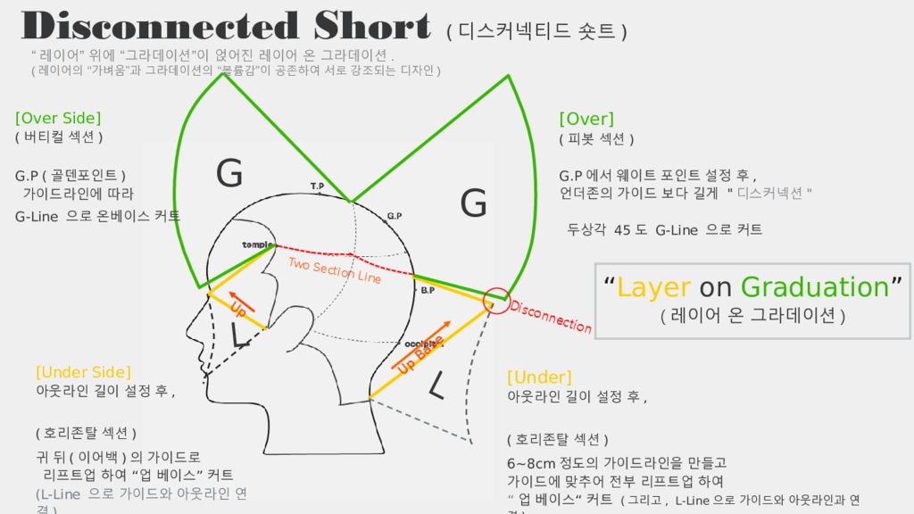 Disconnected Short ( 디스커넥티드 숏트 ) Two Section Line Up Base L G L G Disconnection “ Layer on Graduation ” ( 레이어 온 그라데이션 ) [Under] 아웃라인 길이 설정 후, ( 호리존탈 섹션 ) 6 ~ 8 cm정도의 가이드라인 을 만들고 가이드에 맞추어 전부 리프트업 하여 “ 업 베이스 “ 커트 ( 그리고, L-Line 으로 가이드와 아웃라인과 연결 ) [Over] ( 피봇 섹션 ) G.P 에서 웨이트 포인트 설정 후, 언더존의 가이드 보다 길게 " 디스커넥션 " 두상각 45도 G-Line 으로 커트 [Under Side] 아웃라인 길이 설정 후, ( 호리존탈 섹션 ) 귀 뒤 ( 이어백 ) 의 가이드로 리프트업 하여 “ 업 베이스 ” 커트 ( L-Line 으로 가이드와 아웃라인 연결 ) Up [Over Side] ( 버티컬 섹션 ) G.P ( 골덴포인트 ) 가이드라인에 따라 G-Line 으로 온베이스 커트 “ 레이어 ” 위에 “ 그라데이션 ” 이 얹어진 레이어 온 그라데이션. ( 레이어의 “ 가벼움 ” 과 그라데이션의 “ 볼륨감 ” 이 공존하여 서로 강조되는 디자인 )
