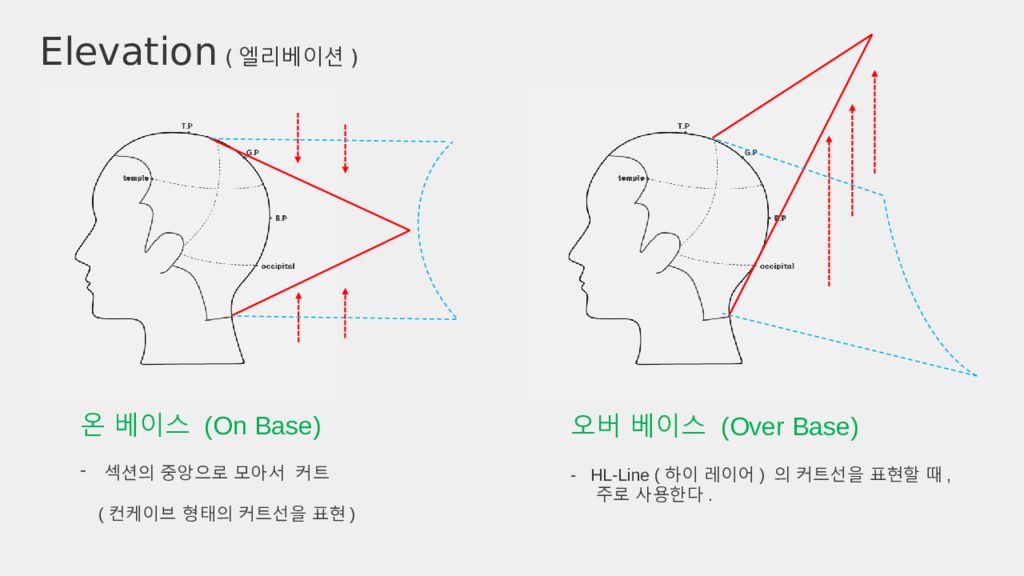 온 베이스 (On Base) 섹션의 중앙으로 모아서 커트 ( 컨케이브 형태의 커트선을 표현 ) 오버 베이스 (Over Base) - HL-Line ( 하이 레이어 ) 의 커트선을 표현할 때, 주로 사용한다. Elevation ( 엘리베이션 )