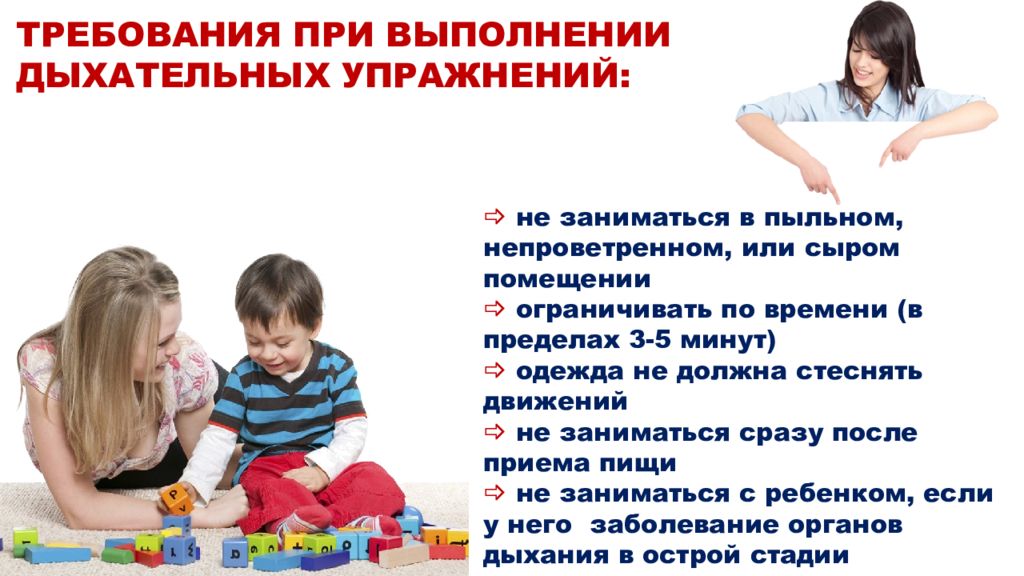 не заниматься в пыльном, непроветренном, или сыром помещении ограничивать по времени (в пределах 3-5 минут ) одежда не должна стеснять движений не заниматься сразу после приема пищи не заниматься с ребенком, если у него заболевание органов дыхания в острой стадии ТРЕБОВАНИЯ ПРИ ВЫПОЛНЕНИИ ДЫХАТЕЛЬНЫХ УПРАЖНЕНИЙ: