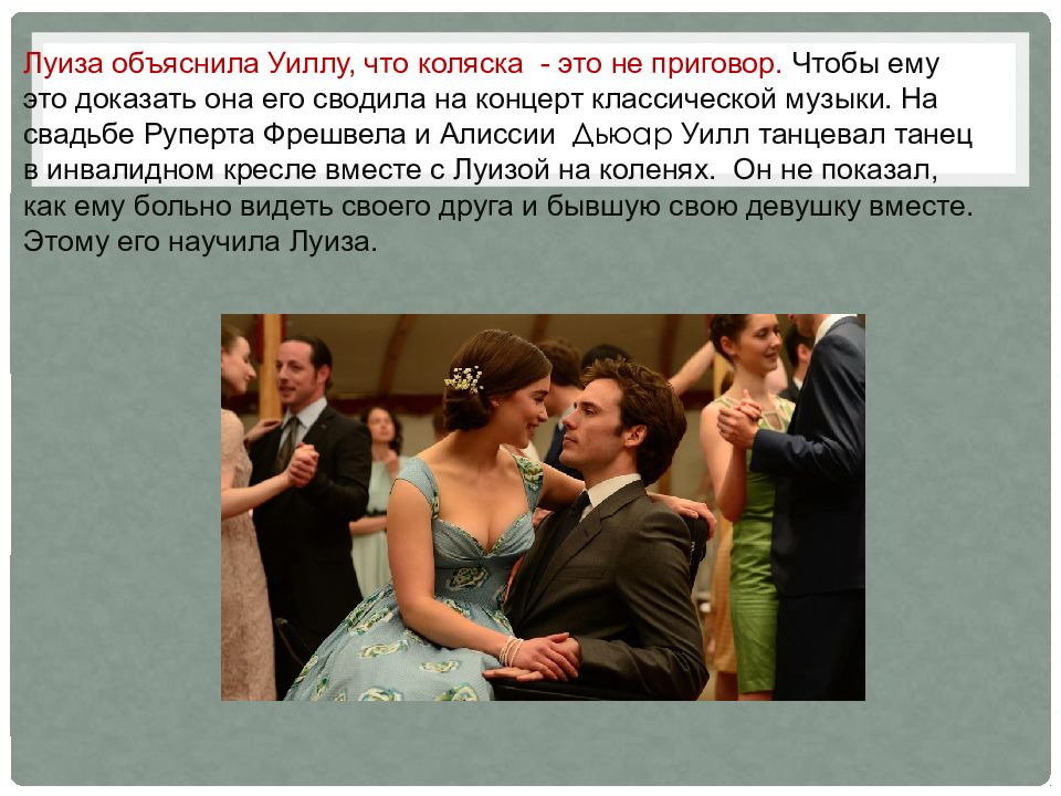Луиза объяснила Уиллу, что коляска - это не приговор. Чтобы ему это доказать она его сводила на концерт классической музыки. На свадьбе Руперта Фрешвела и Алиссии Дьюар Уилл танцевал танец в инвалидном кресле вместе с Л уизой на коленях. Он не показал, как ему больно видеть своего друга и бывшую свою девушку вместе. Этому его научила Луиза.