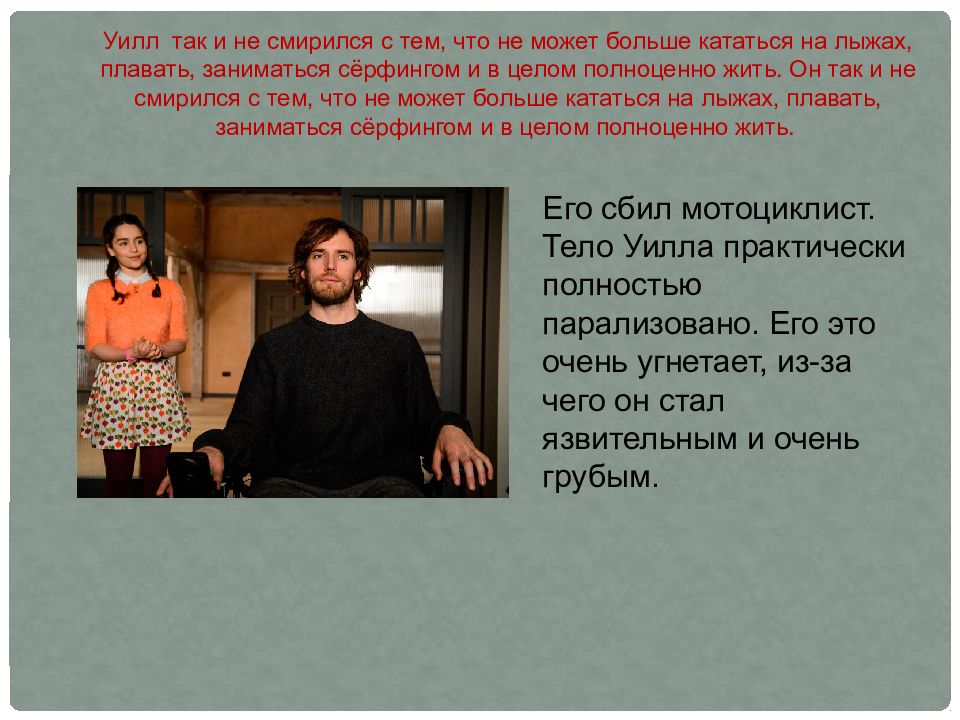 Ж изнь одна и стоит ценить каждый её миг!! Действие романа начинается в 2007 году в Лондоне, и рассказ пойдет о молодом человеке, который попал в аварию, и стал инвалидом-колясочником. Он не желает смирится со своей теперешней участью, пытается расстаться с жизнью. Поэтому его мать Камилла нанимает Луизу Кларк для присмотра за своим сыном. Глубокий психологический подтекст