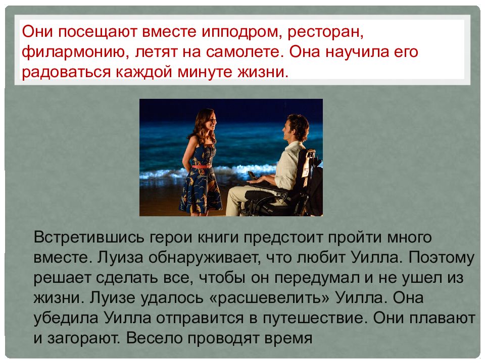Встретившись герои книги предстоит пройти много вместе. Луиза обнаруживает, что любит Уилла. Поэтому решает сделать все, чтобы он передумал и не ушел из жизни. Луизе удалось «расшевелить» Уилла. Она убедила Уилла отправится в путешествие. Они плавают и загорают. Весело проводят время Они посещают вместе ипподром, ресторан, филармонию, летят на самолете. Она научила его радоваться каждой минуте жизни.