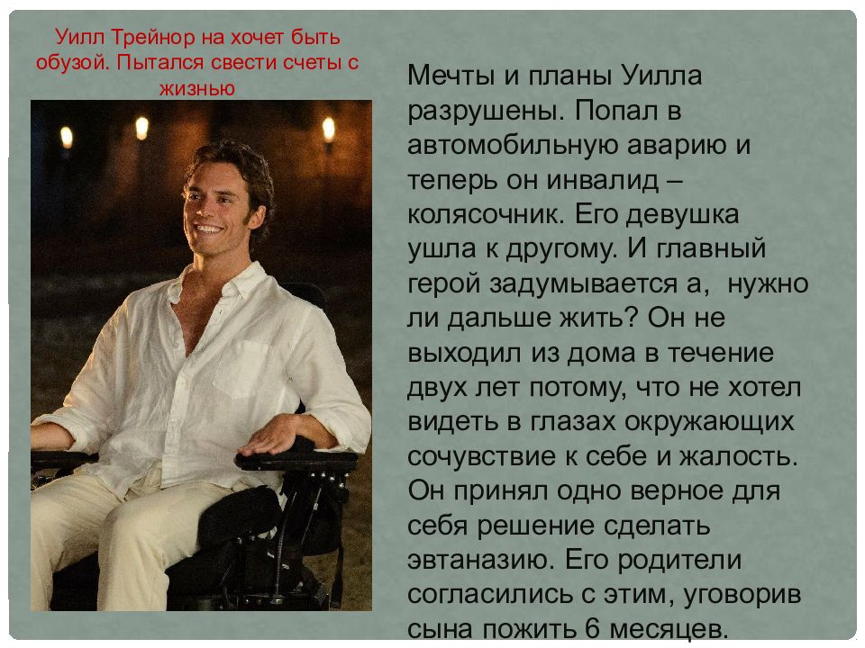 Мечты и планы Уилла разрушены. Попал в автомобильную аварию и теперь он инвалид – колясочник. Его девушка ушла к другому. И главный герой задумывается а, нужно ли дальше жить? Он не выходил из дома в течение двух лет потому, что не хотел видеть в глазах окружающих сочувствие к себе и жалость. Он принял одно верное для себя решение сделать эвтаназию. Его родители согласились с этим, уговорив сына пожить 6 месяцев. Уилл Трейнор на хочет быть обузой. Пытался свести счеты с жизнью