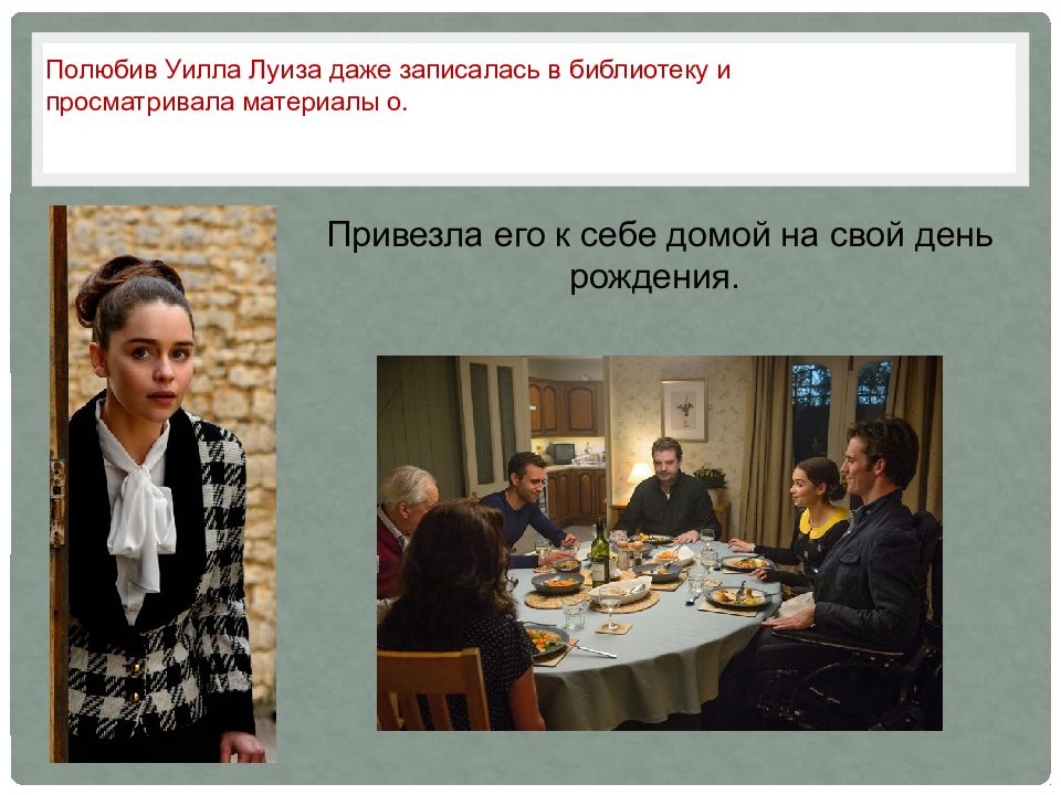 Привезла его к себе домой на свой день рождения. Полюбив Уилла Луиза даже записалась в библиотеку и просматривала материалы о.