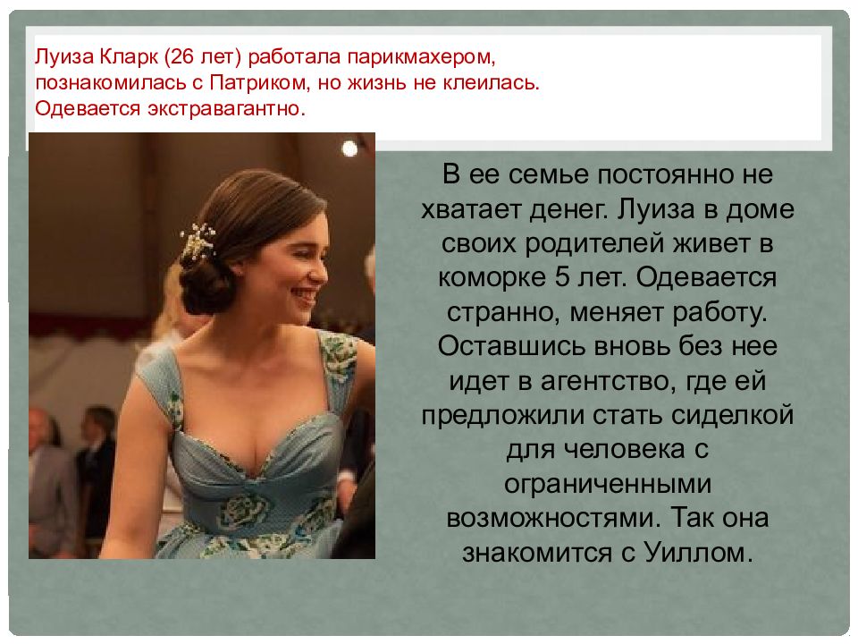 В ее семье постоянно не хватает денег. Луиза в доме своих родителей живет в коморке 5 лет. Одевается странно, меняет работу. Оставшись вновь без нее идет в агентство, где ей предложили стать сиделкой для человека с ограниченными возможностями. Так она знакомится с Уиллом. Луиза Кларк (26 лет) работала парикмахером, познакомилась с Патриком, но жизнь не клеилась. Одевается экстравагантно.