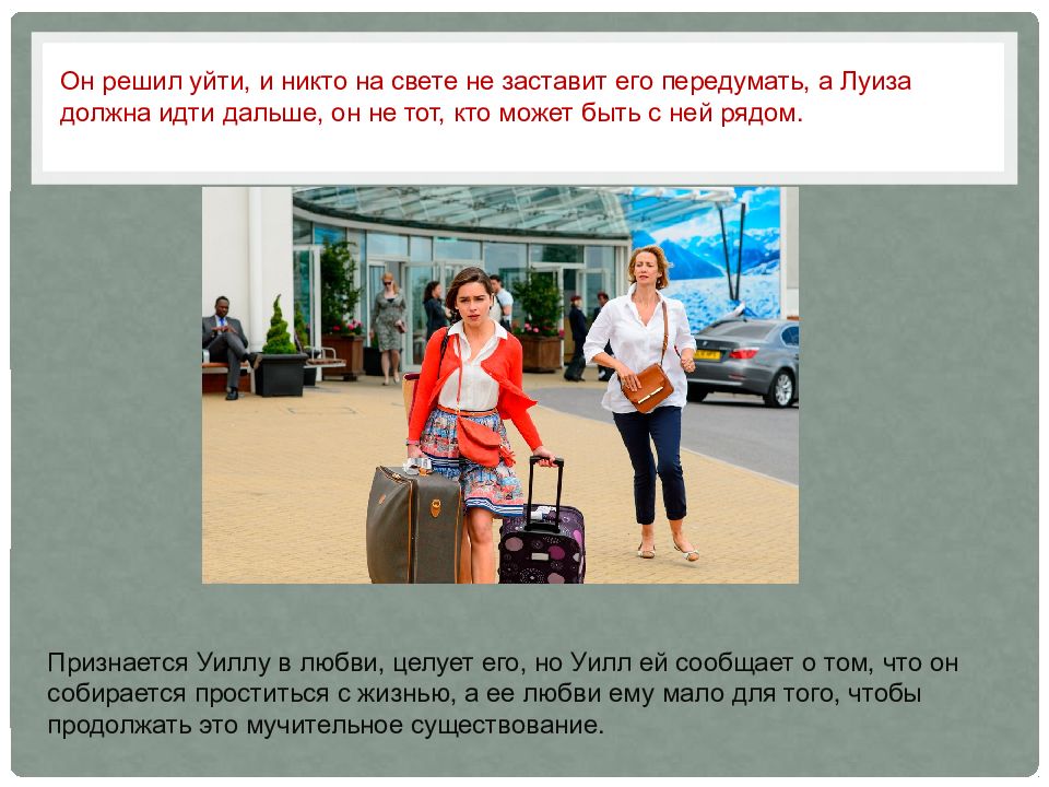 Признается Уиллу в любви, целует его, но Уилл ей сообщает о том, что он собирается проститься с жизнью, а ее любви ему мало для того, чтобы продолжать это мучительное существование. Он решил уйти, и никто на свете не заставит его передумать, а Луиза должна идти дальше, он не тот, кто может быть с ней рядом.