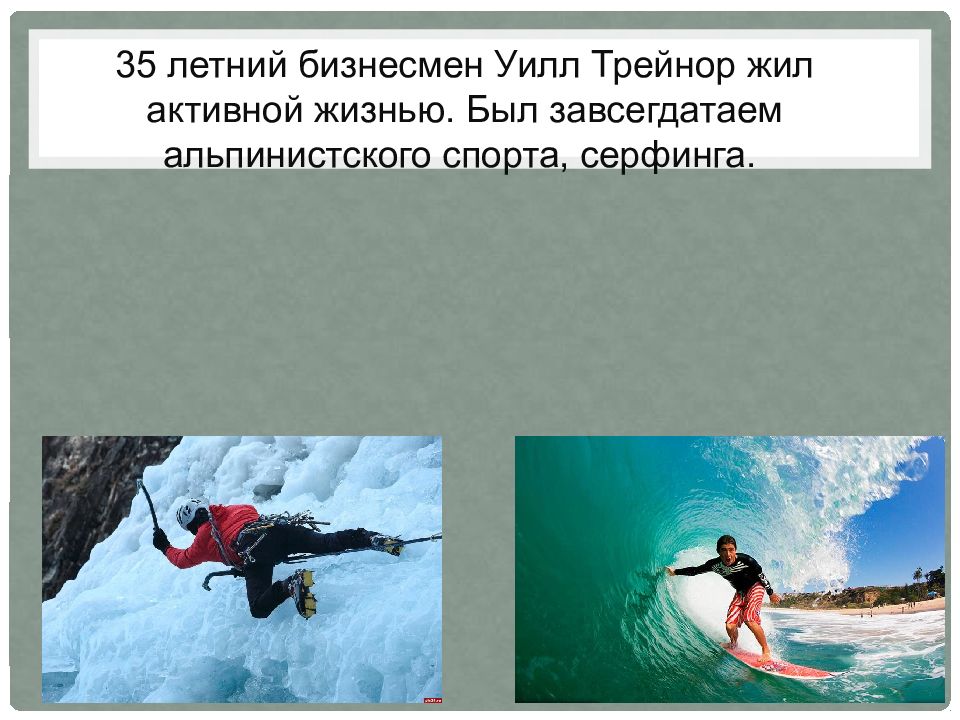35 летний бизнесмен Уилл Трейнор жил активной жизнью. Был завсегдатаем альпинистского спорта, серфинга.