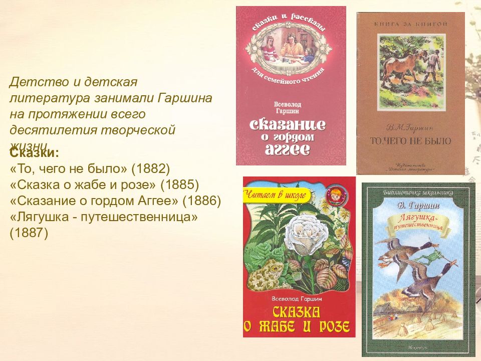 Детство и детская литература занимали Гаршина на протяжении всего десятилетия творческой жизни. Сказки: «То, чего не было» (1882) «Сказка о жабе и розе» (1885) «Сказание о гордом Аггее» (1886) «Лягушка - путешественница» (1887)