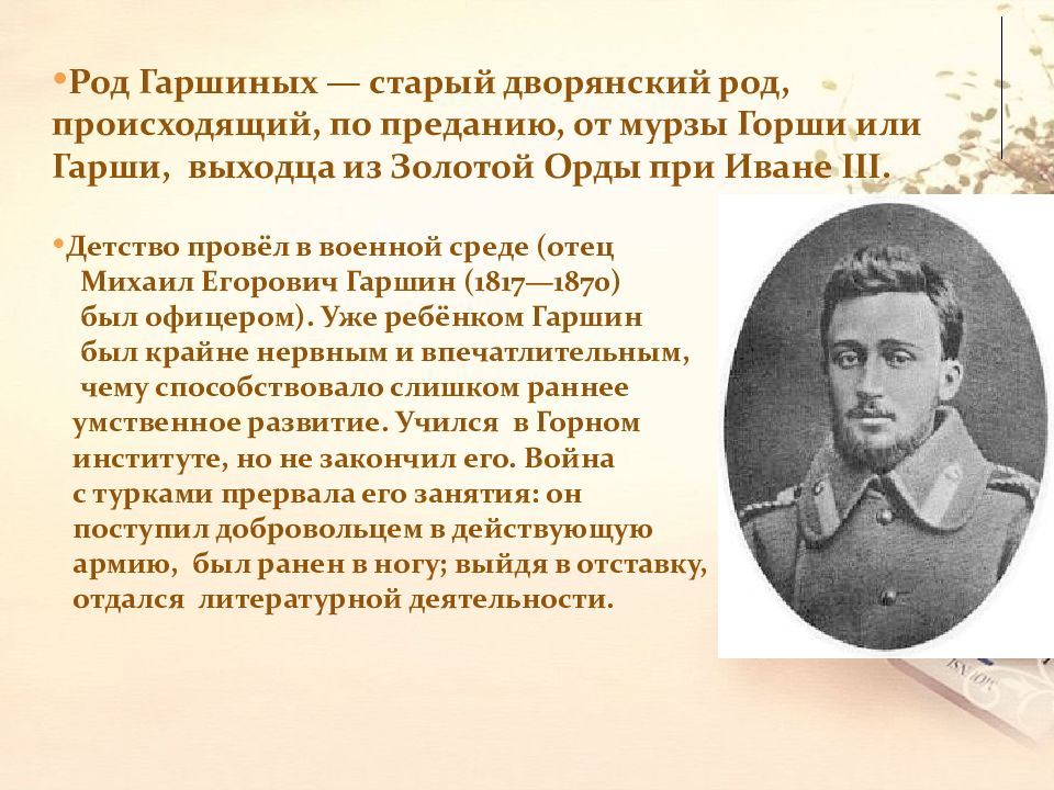 Род Гаршиных — старый дворянский род, происходящий, по преданию, от мурзы Горши или Гарши, выходца из Золотой Орды при Иване III. Детство провёл в военной среде (отец Михаил Егорович Гаршин (1817—1870) был офицером). Уже ребёнком Гаршин был крайне нервным и впечатлительным, чему способствовало слишком раннее умственное развитие. Учился в Горном институте, но не закончил его. Война с турками прервала его занятия: он поступил добровольцем в действующую армию, был ранен в ногу; выйдя в отставку, отдался литературной деятельности.