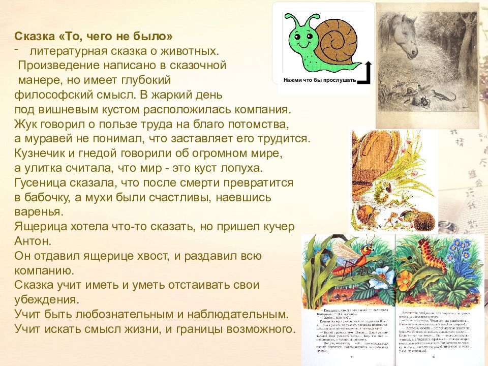Сказка «То, чего не было» литературная сказка о животных. Произведение написано в сказочной манере, но имеет глубокий философский смысл. В жаркий день под вишневым кустом расположилась компания. Жук говорил о пользе труда на благо потомства, а муравей не понимал, что заставляет его трудится. Кузнечик и гнедой говорили об огромном мире, а улитка считала, что мир - это куст лопуха. Гусеница сказала, что после смерти превратится в бабочку, а мухи были счастливы, наевшись варенья. Ящерица хотела что-то сказать, но пришел кучер Антон. Он отдавил ящерице хвост, и раздавил всю компанию. Сказка учит иметь и уметь отстаивать свои убеждения. Учит быть любознательным и наблюдательным. Учит искать смысл жизни, и границы возможного. Нажми что бы прослушать