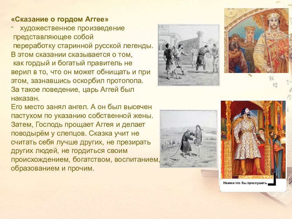 «Сказание о гордом Аггее» художественное произведение представляющее собой переработку старинной русской легенды. В этом сказании сказывается о том, как гордый и богатый правитель не верил в то, что он может обнищать и при этом, зазнавшись оскорбил протопопа. За такое поведение, царь Аггей был наказан. Его место занял ангел. А он был высечен пастухом по указанию собственной жены. Затем, Господь прощает Аггея и делает поводырём у слепцов. Сказка учит не считать себя лучше других, не презирать других людей, не гордиться своим происхождением, богатством, воспитанием, образованием и прочим. Нажми что бы прослушать