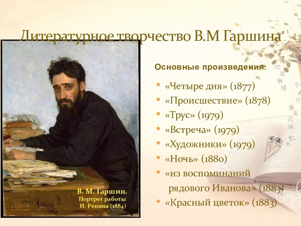 В. М. Гаршин. Портрет работы И. Репина (1884) Литературное творчество В.М Гаршина «Четыре дня» (1877) «Происшествие» (1878) «Трус» (1979) «Встреча» (1979) «Художники» (1979) «Ночь» (1880) «из воспоминаний рядового Иванова» (1883) «Красный цветок» (1883) Основные произведения :