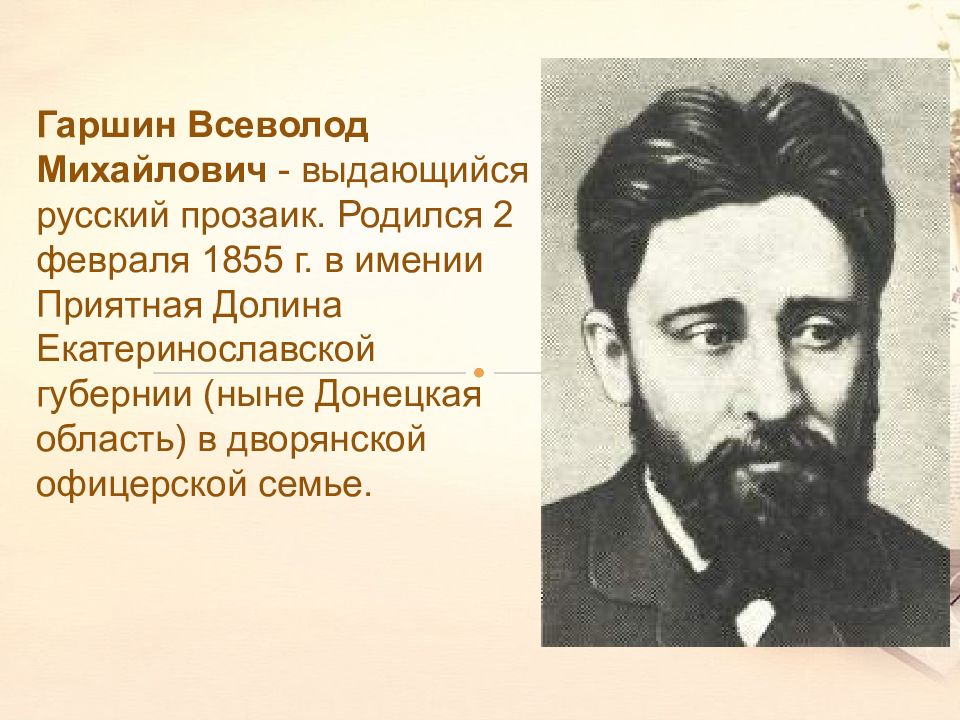 Гаршин Всеволод Михайлович - выдающийся русский прозаик. Родился 2 февраля 1855 г. в имении Приятная Долина Екатеринославской губернии (ныне Донецкая область) в дворянской офицерской семье.
