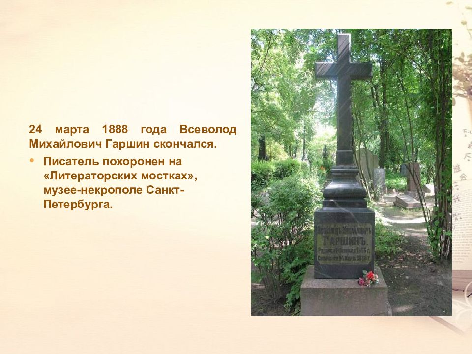 24 марта 1888 года Всеволод Михайлович Гаршин скончался. Писатель похоронен на «Литераторских мостках», музее-некрополе Санкт-Петербурга.