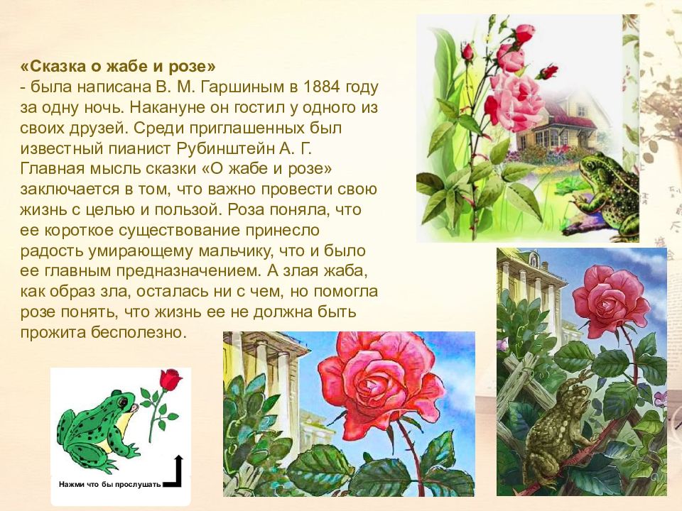 «Сказка о жабе и розе» - была написана В. М. Гаршиным в 1884 году за одну ночь. Накануне он гостил у одного из своих друзей. Среди приглашенных был известный пианист Рубинштейн А. Г. Главная мысль сказки «О жабе и розе» заключается в том, что важно провести свою жизнь с целью и пользой. Роза поняла, что ее короткое существование принесло радость умирающему мальчику, что и было ее главным предназначением. А злая жаба, как образ зла, осталась ни с чем, но помогла розе понять, что жизнь ее не должна быть прожита бесполезно. Нажми что бы прослушать