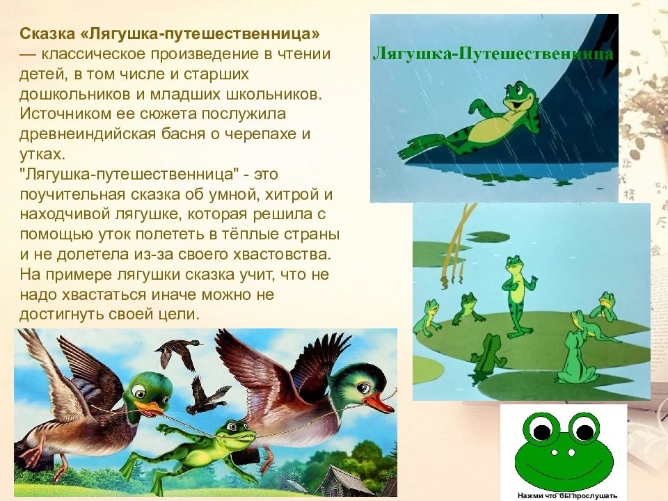 Сказка «Лягушка-путешественница» — классическое произведение в чтении детей, в том числе и старших дошкольников и младших школьников. Источником ее сюжета послужила древнеиндийская басня о черепахе и утках. "Лягушка-путешественница" - это поучительная сказка об умной, хитрой и находчивой лягушке, которая решила с помощью уток полететь в тёплые страны и не долетела из-за своего хвастовства. На примере лягушки сказка учит, что не надо хвастаться иначе можно не достигнуть своей цели. Нажми что бы прослушать