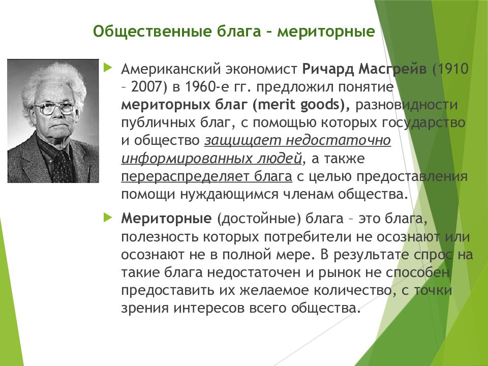 Американский экономист Ричард Масгрейв (1910 – 2007) в 1960-е гг. предложил понятие мериторных благ ( merit goods ), разновидности публичных благ, с помощью которых государство и общество защищает недостаточно информированных людей, а также перераспределяет блага с целью предоставления помощи нуждающимся членам общества. Мериторные (достойные) блага – это блага, полезность которых потребители не осознают или осознают не в полной мере. В результате спрос на такие блага недостаточен и рынок не способен предоставить их желаемое количество, с точки зрения интересов всего общества.