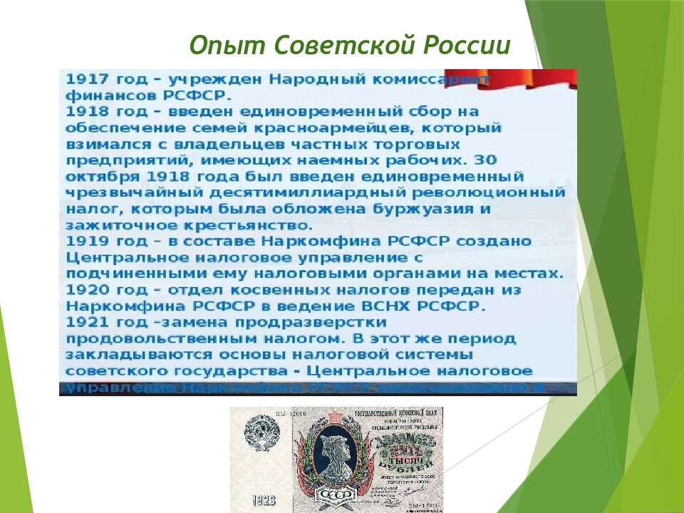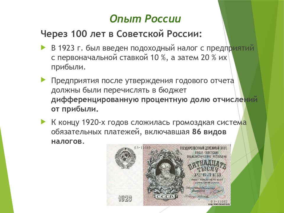 Через 100 лет в Советской России: В 1923 г. был введен подоходный налог с предприятий с первоначальной ставкой 10 %, а затем 20 % их прибыли. Предприятия после утверждения годового отчета должны были перечислять в бюджет дифференцированную процентную долю отчислений от прибыли. К концу 1920-х годов сложилась громоздкая система обязательных платежей, включавшая 86 видов налогов.