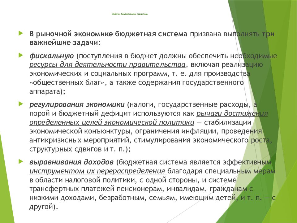 В рыночной экономике бюджетная система призвана выполнять три важнейшие задачи: фискальную (поступления в бюджет должны обеспечить необходимые ресурсы для деятельности правительства, включая реализацию экономических и социальных программ, т. е. для производства « общественных благ», а также содержания государственного аппарата); регулирования экономики (налоги, государственные расходы, а порой и бюджетный дефицит используются как рычаги достижения определенных целей экономической политики — стабилизации экономической конъюнктуры, ограничения инфляции, проведения антикризисных мероприятий, стимулирования экономического роста, структурных сдвигов и т. п.); выравнивания доходов (бюджетная система является эффективным инструментом их перераспределения благодаря специальным мерам в области налоговой политики, с одной стороны, и системе трансфертных платежей пенсионерам, инвалидам, гражданам с низкими доходами, безработным, семьям, имеющим детей, и т. п. — с другой).