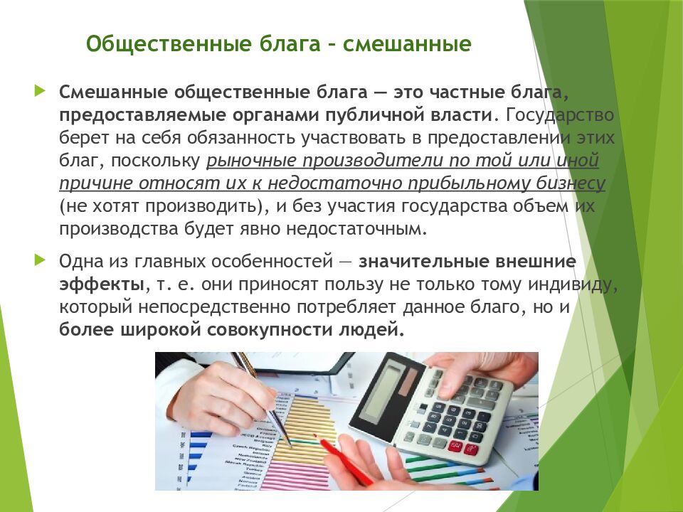 Смешанные общественные блага — это частные блага, предоставляемые органами публичной власти. Государство берет на себя обязанность участвовать в предоставлении этих благ, поскольку рыночные производители по той или иной причине относят их к недостаточно прибыльному бизнесу (не хотят производить), и без участия государства объем их производства будет явно недостаточным. Одна из главных особенностей — значительные внешние эффекты, т. е. они приносят пользу не только тому индивиду, который непосредственно потребляет данное благо, но и более широкой совокупности людей.