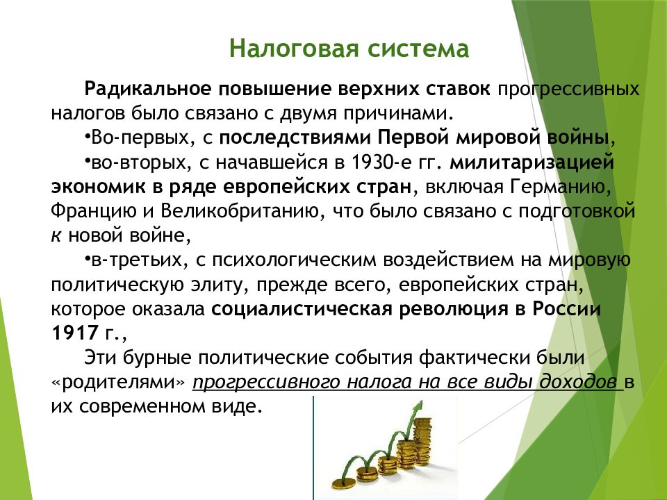 Радикальное повышение верхних ставок прогрессивных налогов было связано с двумя причинами. Во-первых, с последствиями Первой мировой войны, во-вторых, с начавшейся в 1930-е гг. милитаризацией экономик в ряде европейских стран, включая Германию, Францию и Великобританию, что было связано с подготовкой к новой войне, в-третьих, с психологическим воздействием на мировую политическую элиту, прежде всего, европейских стран, которое оказала социалистическая революция в России 1917 г., Эти бурные политические события фактически были «родителями» прогрессивного налога на все виды доходов в их современном виде.