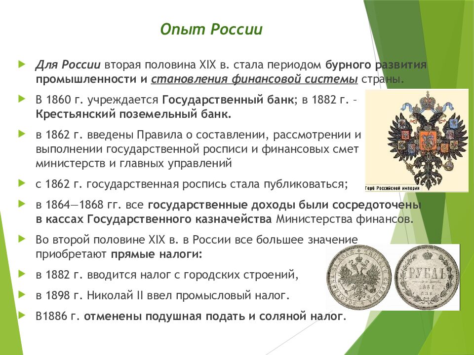 Для России вторая половина XIX в. стала периодом бурного развития промышленности и становления финансовой системы страны. В 1860 г. учреждается Государственный банк ; в 1882 г. – Крестьянский поземельный банк. в 1862 г. введены Правила о составлении, рассмотрении и выполнении государственной росписи и финансовых смет министерств и главных управлений с 1862 г. государственная роспись стала публиковаться; в 1864—1868 гг. все государственные доходы были сосредоточены в кассах Государственного казначейства Министерства финансов. Во второй половине XIX в. в России все большее значение приобретают прямые налоги: в 1882 г. вводится налог с городских строений, в 1898 г. Николай II ввел промысловый налог. В1886 г. отменены подушная подать и соляной налог.