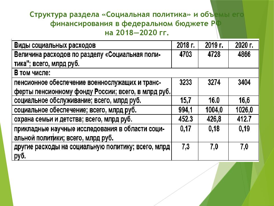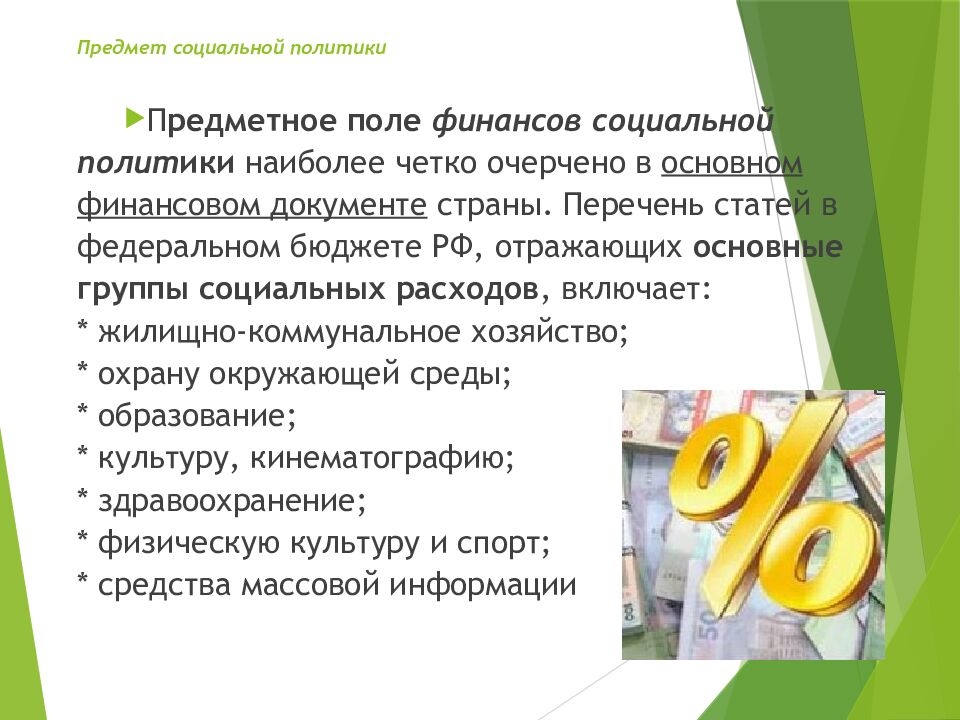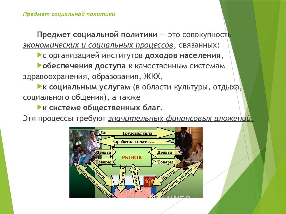 Предмет социальной политики — это совокупность экономических и социальных процессов, связанных: с организацией институтов доходов населения, обеспечения доступа к качественным системам здравоохранения, образования, ЖКХ, к социальным услугам (в области культуры, отдыха, социального общения), а также к системе общественных благ. Эти процессы требуют значительных финансовых вложений.