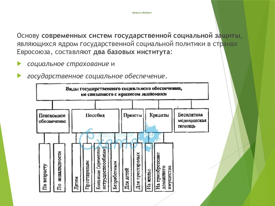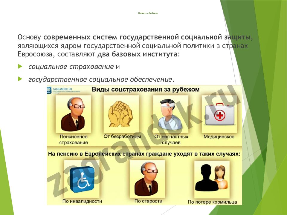 Основу современных систем государственной социальной защиты, являющихся ядром государственной социальной политики в странах Евросоюза, составляют два базовых института : социальное страхование и государственное социальное обеспечение.