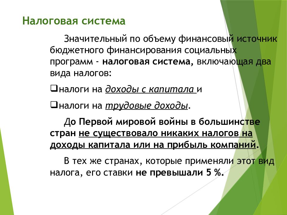 Значительный по объему финансовый источник бюджетного финансирования социальных программ - налоговая система, включающая два вида налогов: налоги на доходы с капитала и налоги на трудовые доходы. Д о Первой мировой войны в большинстве стран не существовало никаких налогов на доходы капитала или на прибыль компаний. В тех же странах, которые применяли этот вид налога, его ставки не превышали 5 %.