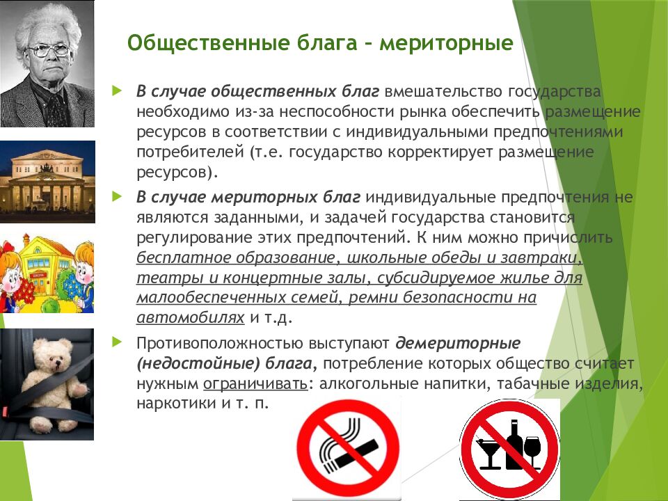 В случае общественных благ вмешательство государства необходимо из-за неспособности рынка обеспечить размещение ресурсов в соответствии с индивидуальными предпочтениями потребителей (т.е. государство корректирует размещение ресурсов). В случае мериторных благ индивидуальные предпочтения не являются заданными, и задачей государства становится регулирование этих предпочтений. К ним можно причислить бесплатное образование, школьные обеды и завтраки, театры и концертные залы, субсидируемое жилье для малообеспеченных семей, ремни безопасности на автомобилях и т.д. Противоположностью выступают демериторные (недостойные) блага, потребление которых общество считает нужным ограничивать : алкогольные напитки, табачные изделия, наркотики и т. п.