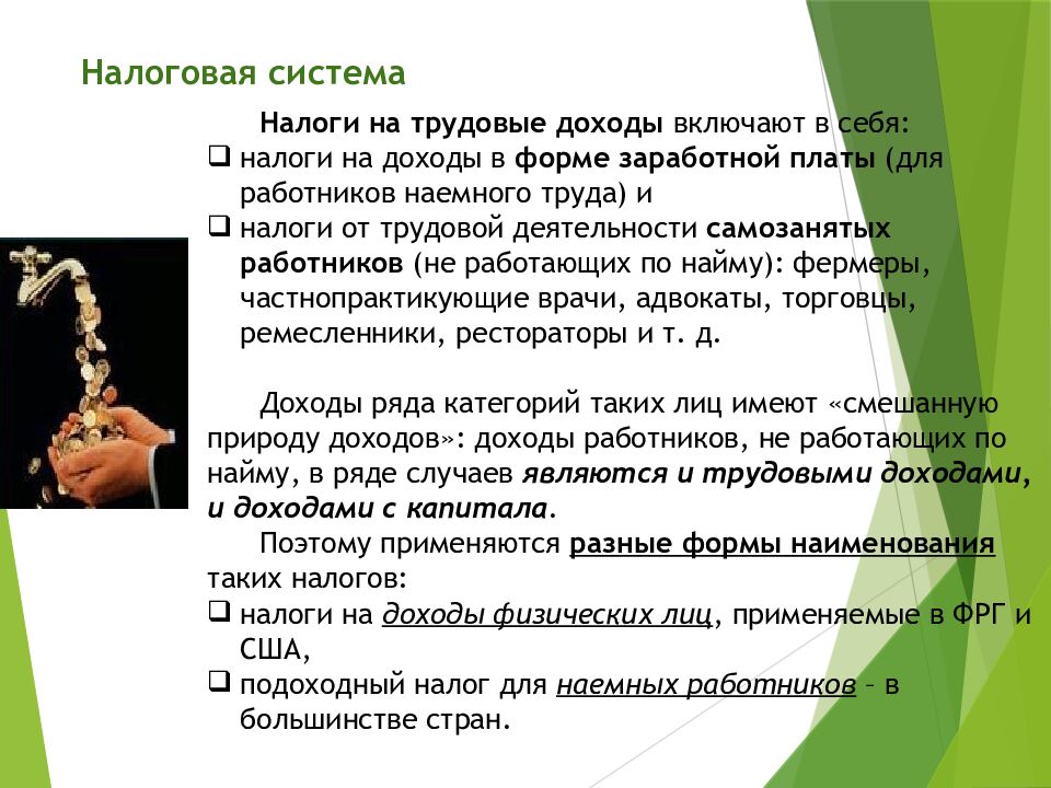 Налоги на трудовые доходы включают в себя: налоги на доходы в форме заработной платы (для работников наемного труда) и налоги от трудовой деятельности самозанятых работников (не работающих по найму ): фермеры, частнопрактикующие врачи, адвокаты, торговцы, ремесленники, рестораторы и т. д. Доходы ряда категорий таких лиц имеют «смешанную природу доходов»: доходы работников, не работающих по найму, в ряде случаев являются и трудовыми доходами, и доходами с капитала. Поэтому применяются разные формы наименования таких налогов: налоги на доходы физических лиц, применяемые в ФРГ и США, подоходный налог для наемных работников – в большинстве стран.