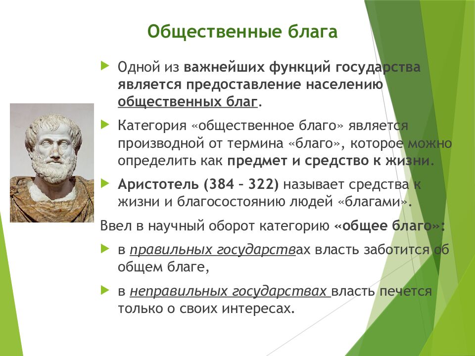 Одной из важнейших функций государства является предоставление населению общественных благ. Категория «общественное благо» является производной от термина «благо», которое можно определить как предмет и средство к жизни. Аристотель (384 – 322) называет средства к жизни и благосостоянию людей «благами ». Ввел в научный оборот категорию «общее благо »: в правильных государств ах власть заботится об общем благе, в неправильных государствах власть печется только о своих интересах.