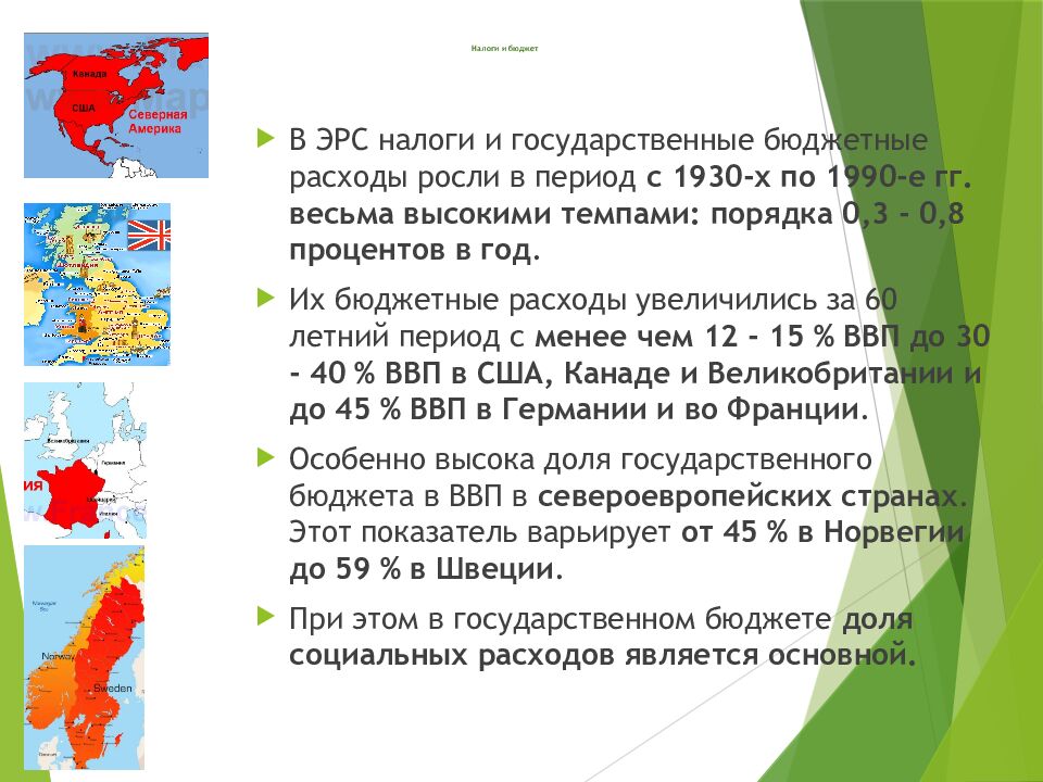 В ЭРС налоги и государственные бюджетные расходы росли в период с 1930-х по 1990-е гг. весьма высокими темпами: порядка 0,3 - 0,8 процентов в год. Их бюджетные расходы увеличились за 60 летний период с менее чем 12 - 15 % ВВП до 30 - 40 % ВВП в США, Канаде и Великобритании и до 45 % ВВП в Германии и во Франции. Особенно высока доля государственного бюджета в ВВП в североевропейских странах. Этот показатель варьирует от 45 % в Норвегии до 59 % в Швеции. При этом в государственном бюджете доля социальных расходов является основной.