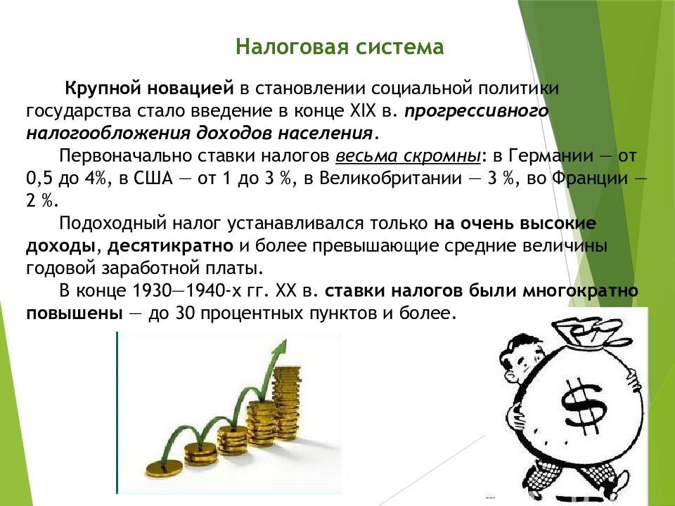 Крупной новацией в становлении социальной политики государства стало введение в конце XIX в. прогрессивного налогообложения доходов населения. Первоначально ставки налогов весьма скромны : в Германии — от 0,5 до 4%, в США — от 1 до 3 %, в Великобритании — 3 %, во Франции — 2 %. Подоходный налог устанавливался только на очень высокие доходы, десятикратно и более превышающие средние величины годовой заработной платы. В конце 1930—1940-х гг. XX в. ставки налогов были многократно повышены — до 30 процентных пунктов и более.